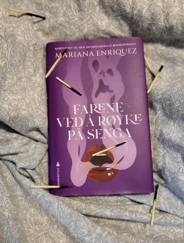 Når jeg stod i køen for å få bøker signert av forfatterne snakket jeg med en annen som også hadde hørt på samtalen. Jeg hadde en bunke med John Ajvide Lindqvist bøker jeg håpet på å få signert, hun hadde en bunke med Mariana Enríquez bøker. Jeg hadde aldri lest noe av Enríquez, hun hadde aldri lest noe av Lindqvist. Vi gikk fra hverandre med oppfordringen av å lese hverandres favorittforfattere. Vel, nå har jeg lest min første novellesamling fra Enríquez, Farene ved å røyke på senga, og wow… Dette er noen av de beste skrekknovellene jeg noensinne har lest!
