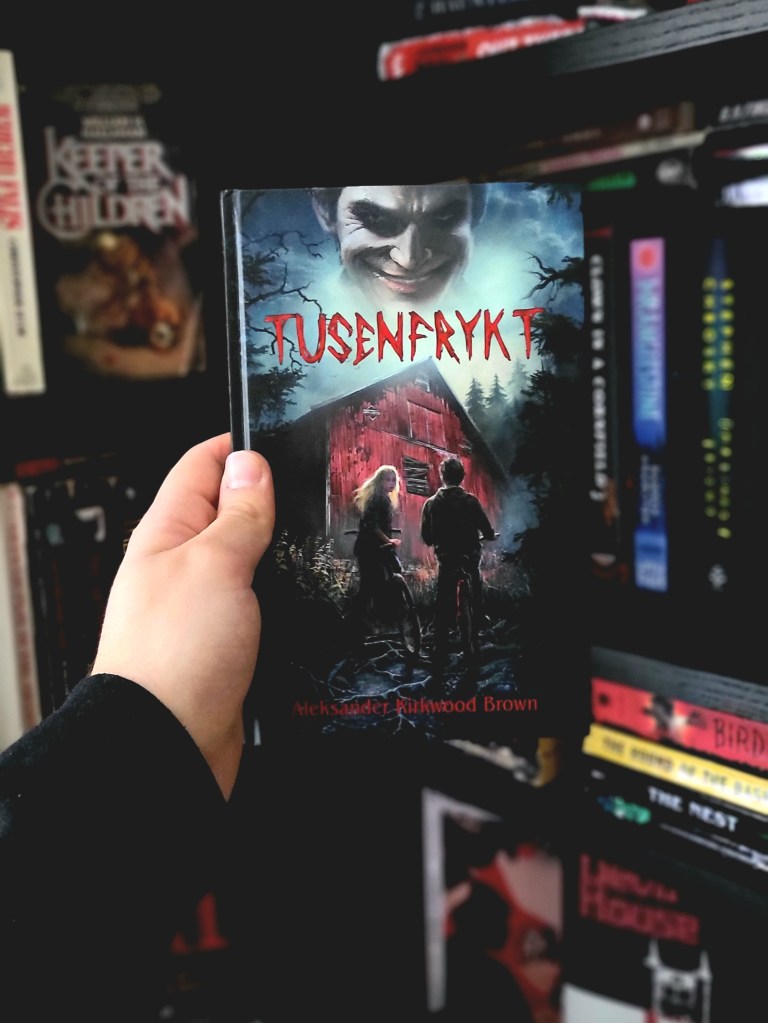 Da jeg så omslaget til denne for første gang, var det som at jeg ble sendt tilbake i tid til skolebiblioteket på barneskolen. Det var sjeldent noe av interesse for meg der, og jeg endte ofte opp med en bok jeg ikke ville lese. Frem til jeg fant Kaldt blod-serien til Jørn Jensen. Og det tok bare ett blikk på omslaget til bøkene for at jeg skulle bli hooked! Omslaget til Tusenfrykt, som er illustrert av den utrolig dyktige Ida Skjelbakken (som også illustrerer Trollheim-serien til Arne Lindmo), minner meg skikkelig om omslagene jeg forelsket meg i på barneskolen, samtidig som at det ikke ser “gammeldags” ut. I tillegg minte beskrivelsen av boken meg veldig om de absurde, men underholdende skrekkbøkene jeg vokste opp med. Og det elsker jeg. Jeg lo høyt da jeg leste beskrivelsen av boka for første gang (på en veldig god måte)!